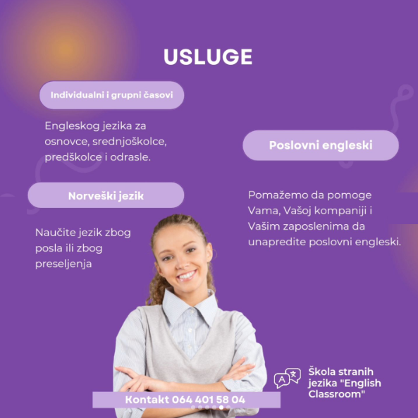 Naša škola nudi individualne i grupne časove engleskog jezika za sve uzraste: od predškolaca do odraslih, ali i poslovni engleski za one koji žele napredovati u karijeri. Takođe, nudimo časove norveškog jezika i usluge prevođenja i sudskog tumača za engleski, francuski i italijanski jezik.